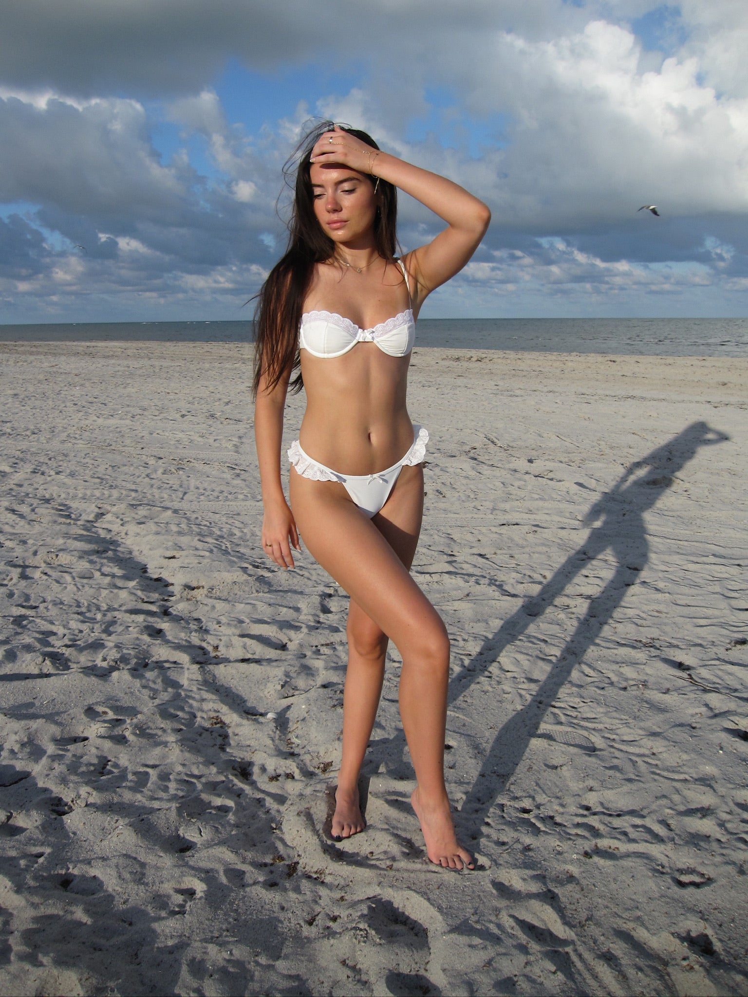 Made for coastal mornings and the girls who romanticize every moment. The Eyelet Bikini blends delicate femininity with a touch of vintage charm, featuring scalloped lace trim, ruffle details, and a flattering underwire top.